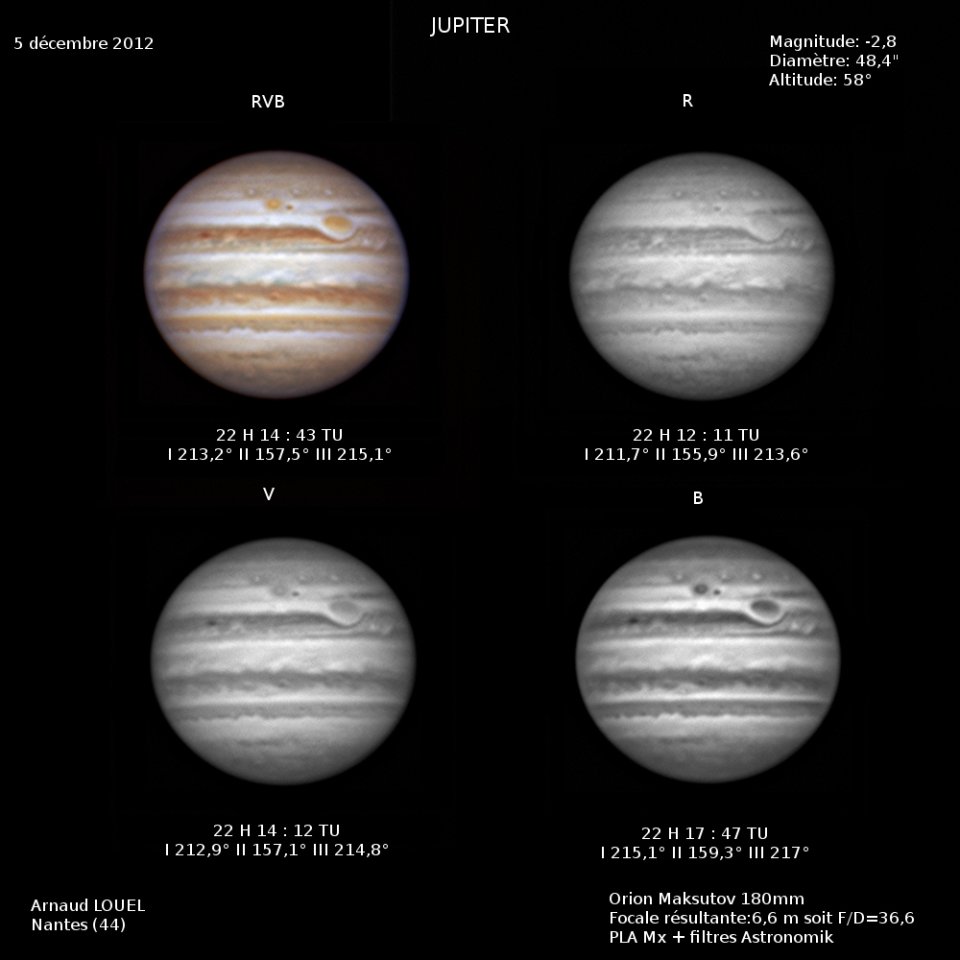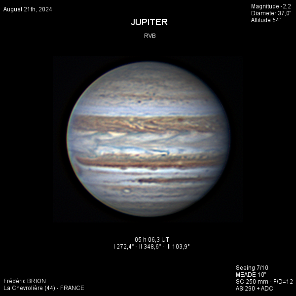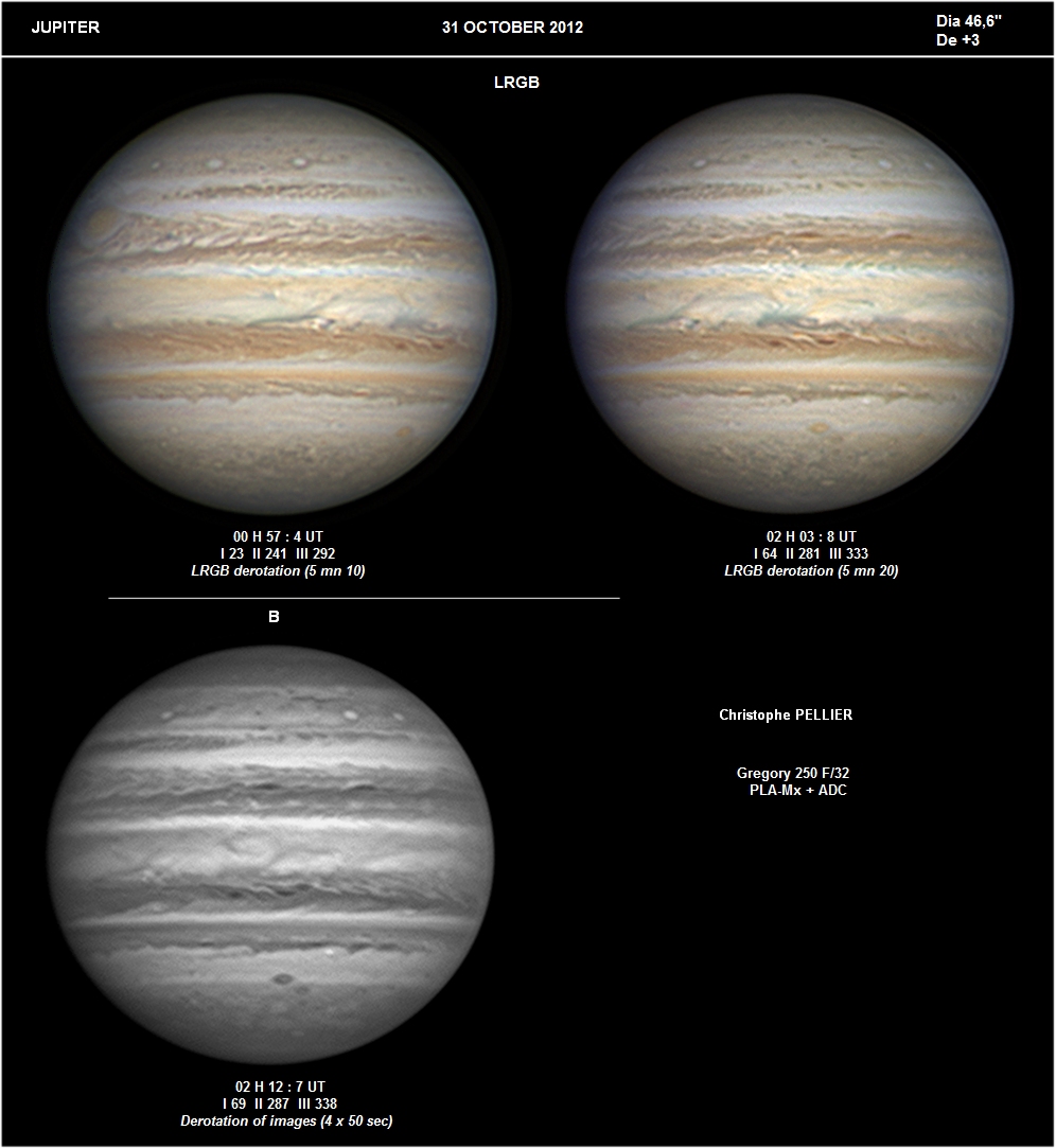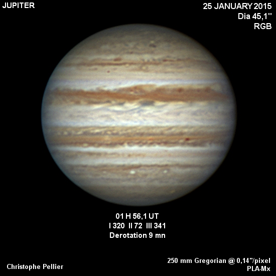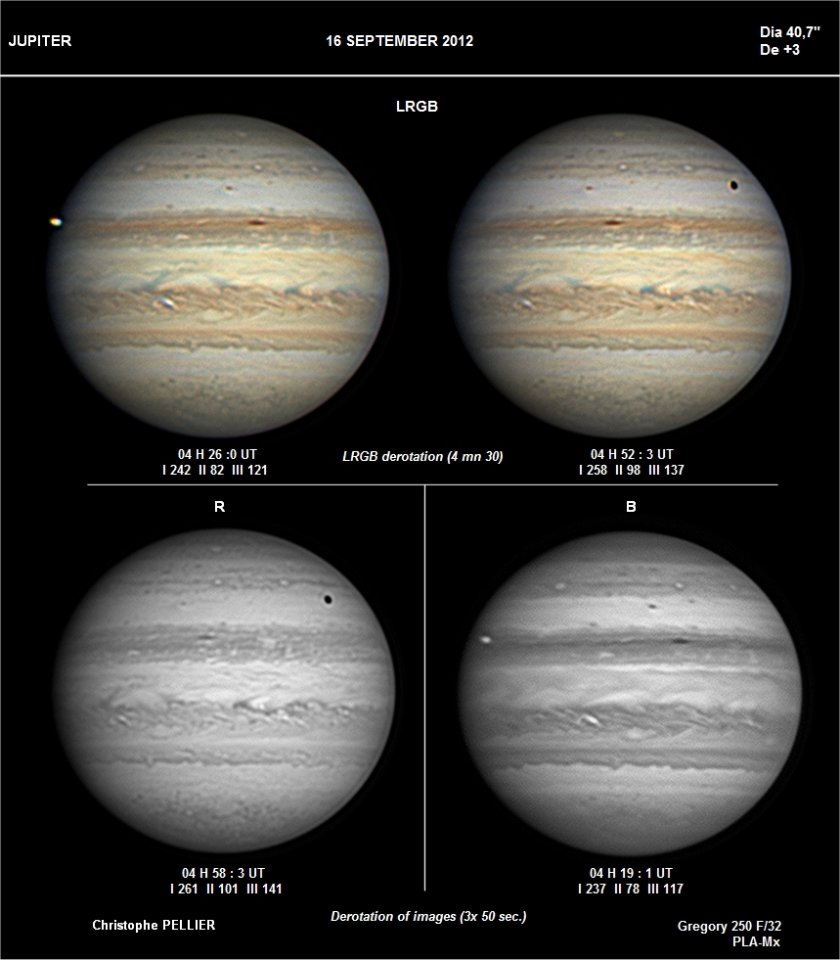 - Paramètres de traitement de l'image : Dérotation vidéo sous Winjupos - Alignement, addition sous Autostakkert 3 - traitement ondelettes sous Registax 6 - Assemblage RVB sous Winjupos