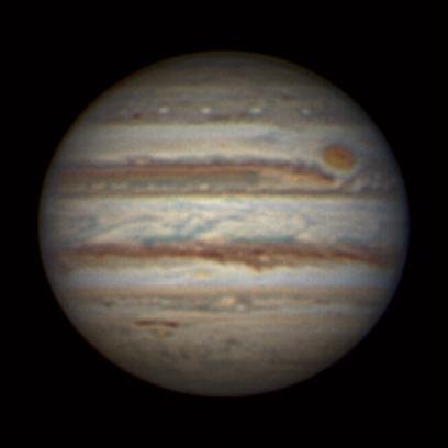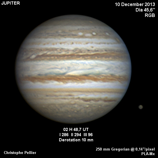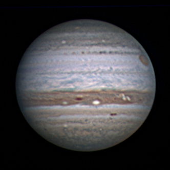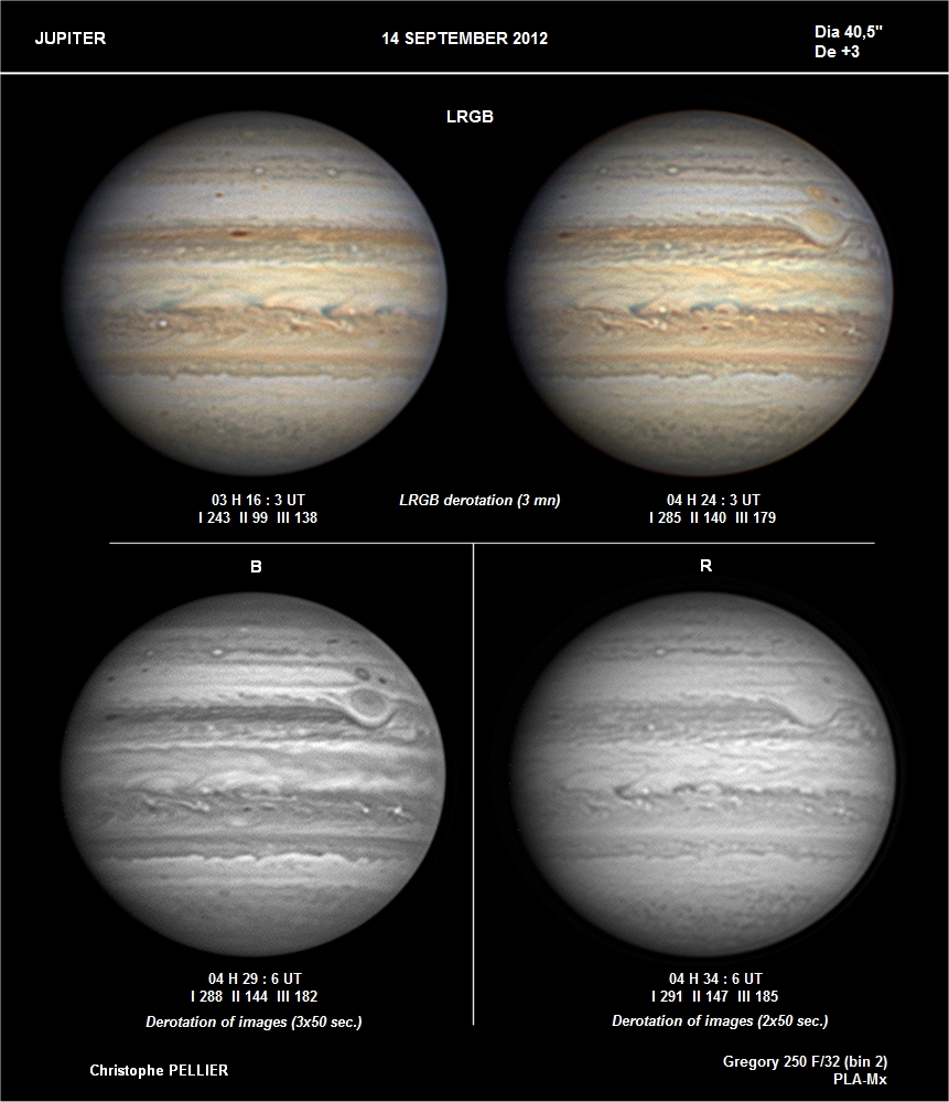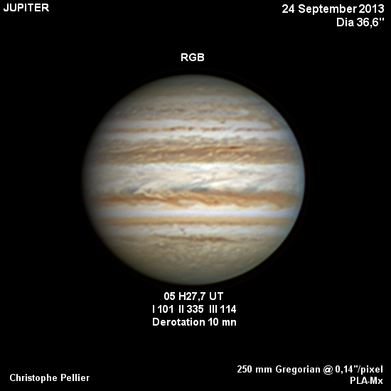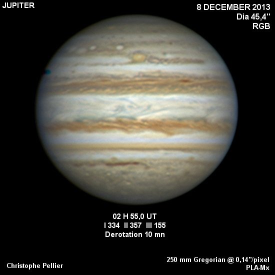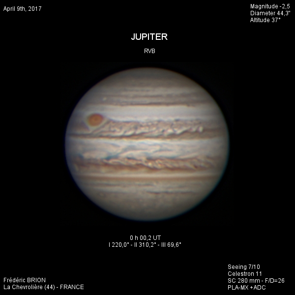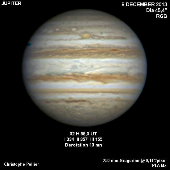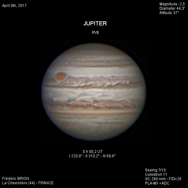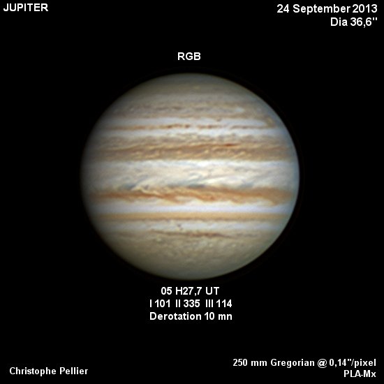 - Paramètres de traitement de l'image : Dérotation vidéo sous Winjupos - Alignement, addition sous Autostakkert 3 - traitement ondelettes sous Registax 6 - Assemblage RVB sous Winjupos