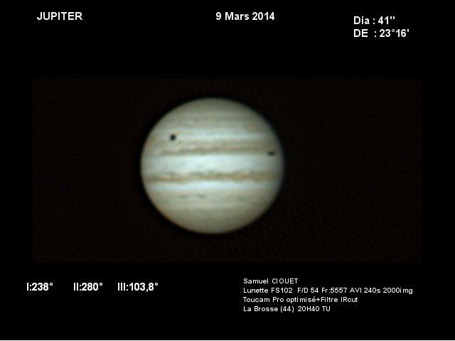 - Paramètres de traitement de l'image : Alignement, addition sous Autostakkert 2, traitement ondelettes sous Registax 6 - Assemblage sous Winjupos