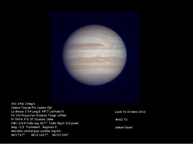 - Instrument et combinaison optique utilisée : Webcam Toucam Pro au foyer d'une lunette Takahashi FS D=102mm F=820mm avec système de projection et oculaire 18 mm (Frésultant : 5,9 m)