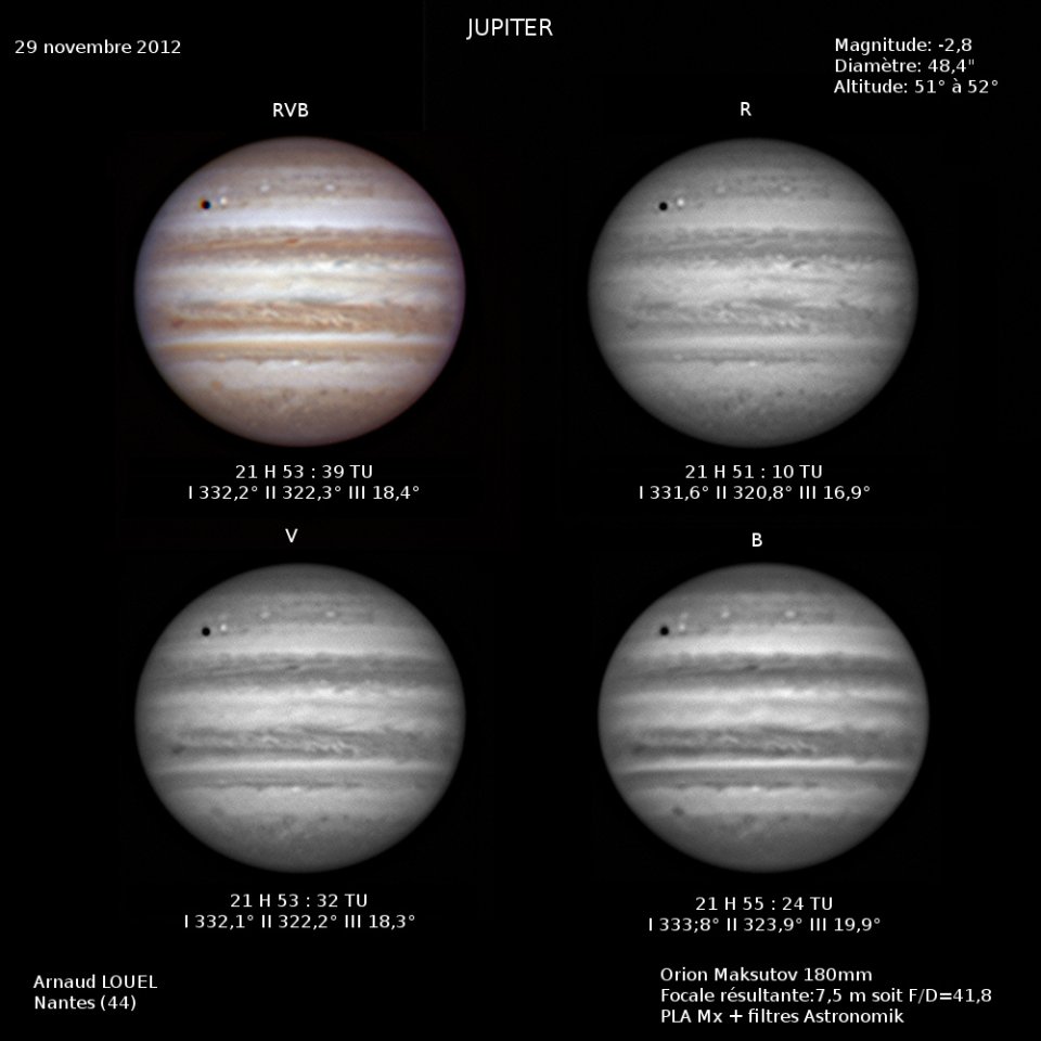 - Paramètres de traitement de l'image : Alignement, addition sous Autostakkert2, traitement ondelettes sous Registax 6 - Assemblage RVB sous Winjupos