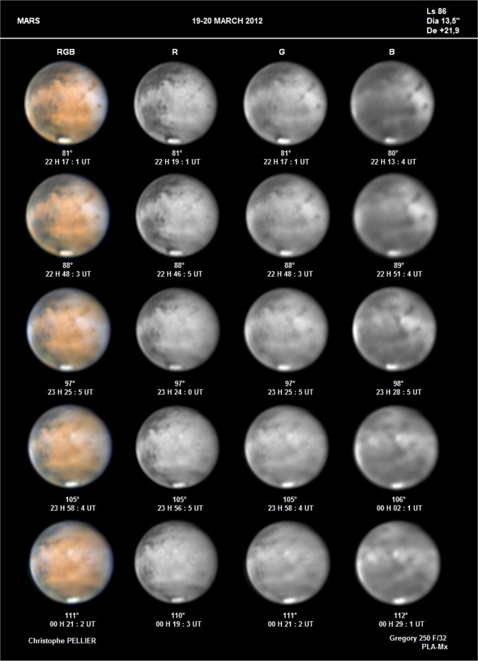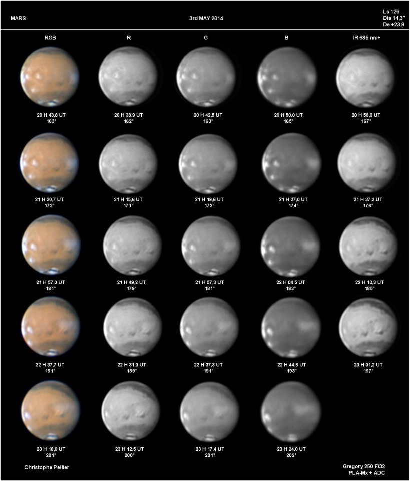 Paramètres de traitement de l'image : Alignement, addition, traitement ondelettes sous Registax 6 - Assemblage RVB sous Winjupos - Commentaire : Sur ces images, les nuages orographiques au-dessus des volcans de Tharsis commencent à se former. Ils apparaissent vers le milieu de la journée martienne et gonflent durant l'après-midi. Sur l'image RVB, il est midi sur Ascraeus, Arsia et Pavonis, mais il n'est que 10 H encore sur Olympus Mons.