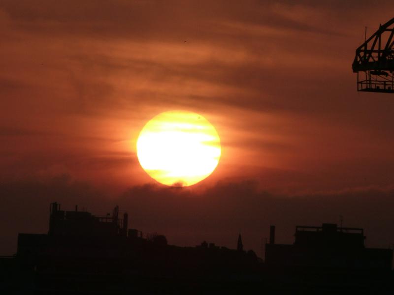 • Commentaire : Le petit disque de Vénus devant le Soleil s'extirpe lentement des nuages devant les immeubles et la grue titan.